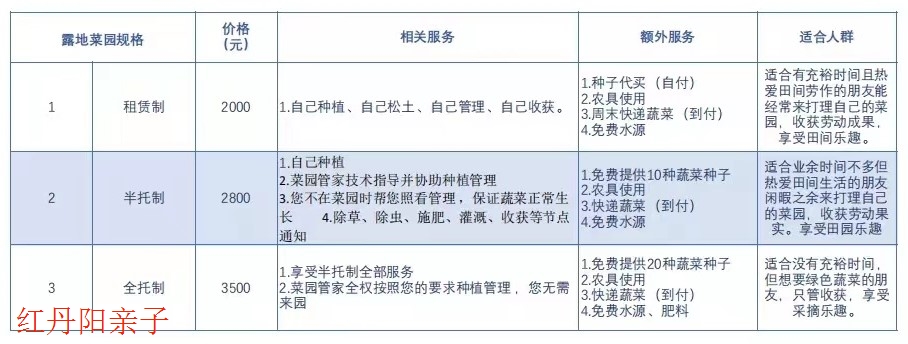 服务方案:根据客户要求,选择适合的作物进行种植,包括蔬菜、水果、谷物等。由园区提供种子、肥料。播种养护采摘需由客户自理,农场提供技术支持服务及简单相关工具。客户可选择自行收获或快递配送(邮费自理)客户在服务期限内拥有该场地冠名及使用权。(使用权仅限农场提供的相关服务)